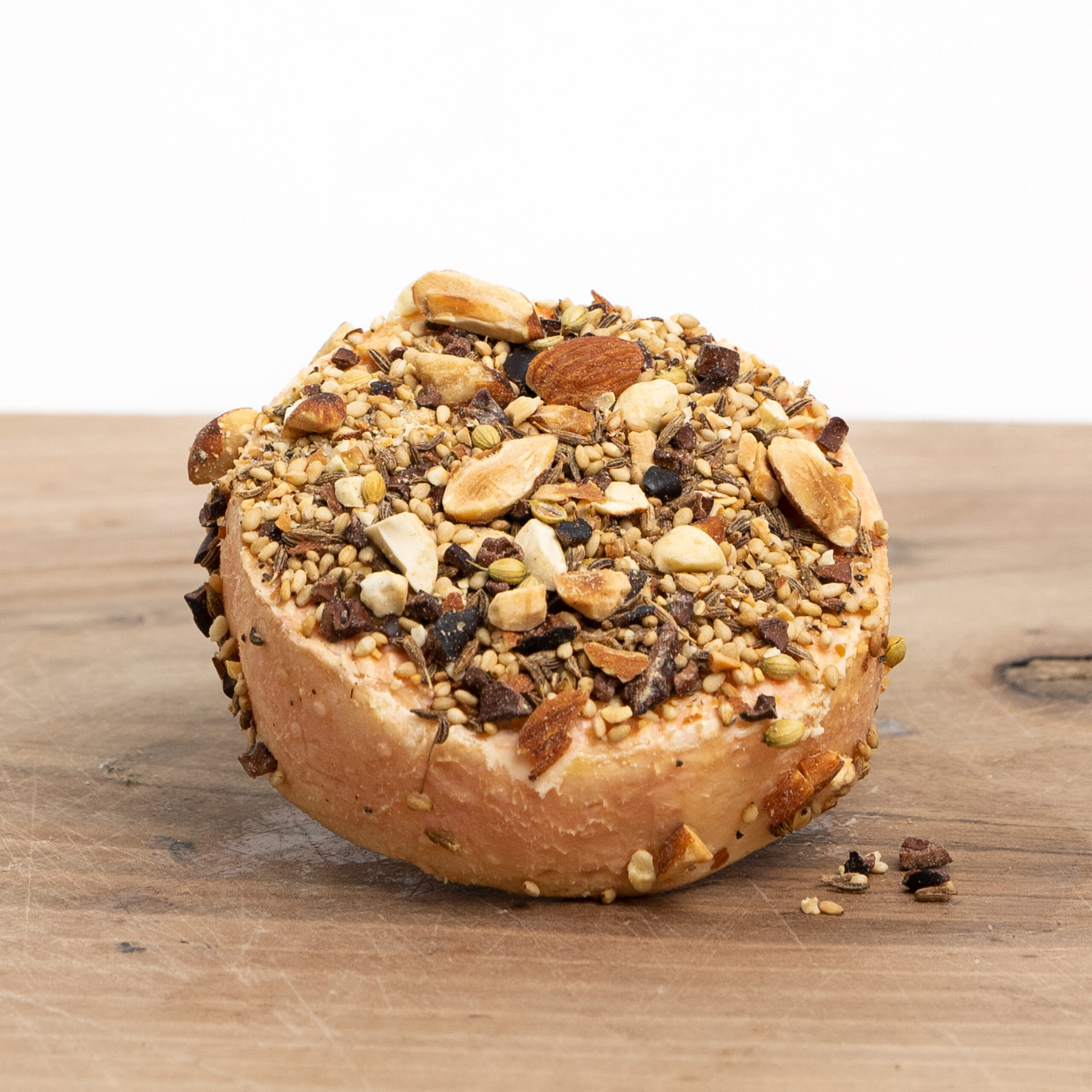 De kaas wordt vlak voor verkoop gewassen met deze noten- en specerijenmelange. Daardoor krijgen de warme, kruidige aroma’s de kans zich goed met de zachte pâte te verbinden. Het resultaat is een roodflorakaas met een aromatisch, licht kruidig karakter en een romige structuur.