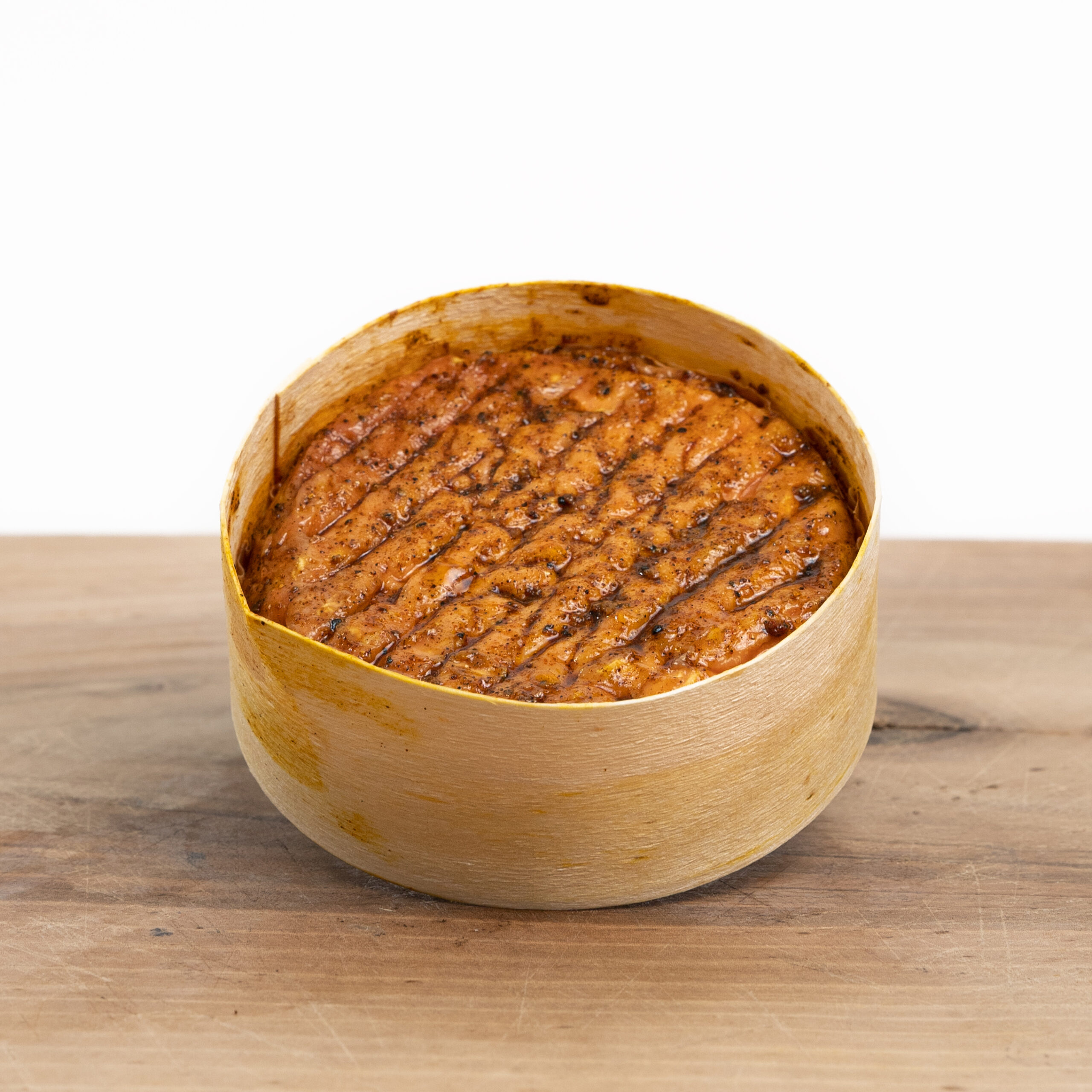 Voor deze bijzondere uitvoering bestrooien we de Époisses met Ras el Hanout, een verfijnde Mediterrane kruidenmix. De kruiden trekken langzaam in de korst en geven extra gelaagdheid. Een kleine hoeveelheid arganolie wordt toegevoegd om de kruiden te binden en een subtiele nootachtige nuance mee te geven.