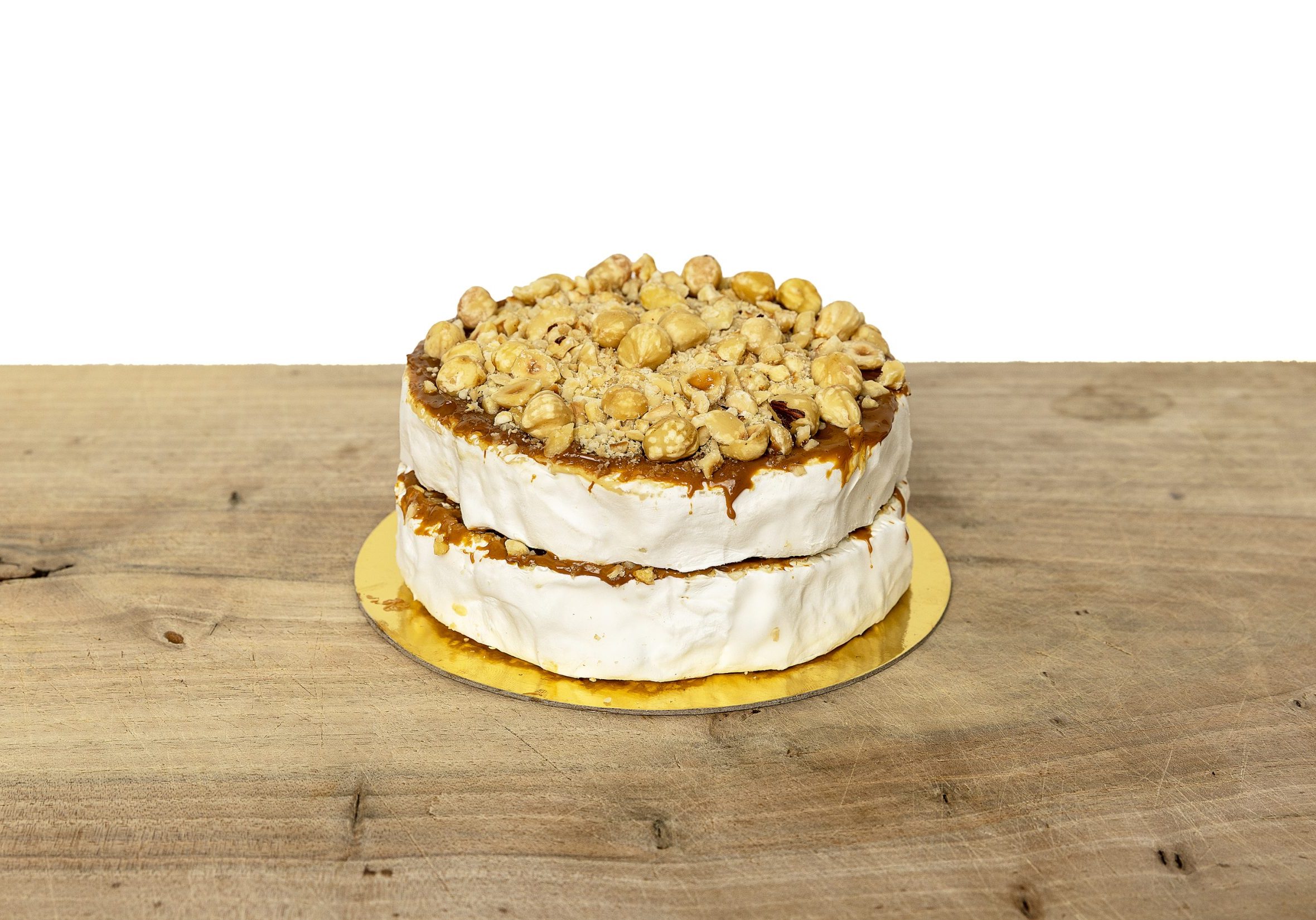 De basis is een Franse triple-crème kaas die van zichzelf al zacht en vol is. Die snijden we door en vullen we met een romige boterkaramel (caramel au beurre salé). Daarna gaat hij weer dicht en werken we hem af met stukjes hazelnoot voor een beetje crunch.