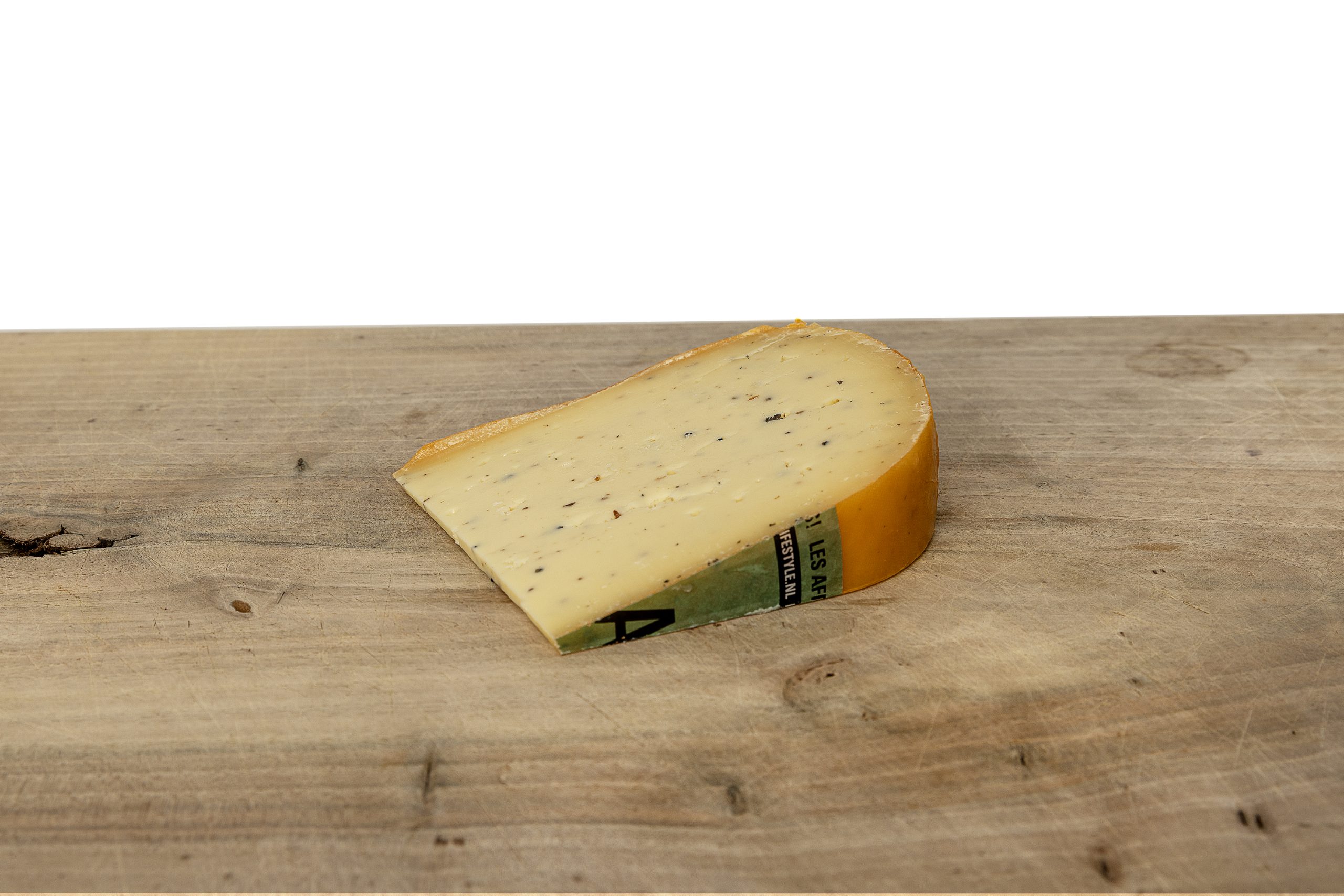 Deze Goudse kaas met truffel wordt op de boerderij gemaakt van gethermiseerde koemelk. Tijdens het maken worden kleine stukjes zomertruffel door de kaas gemengd.