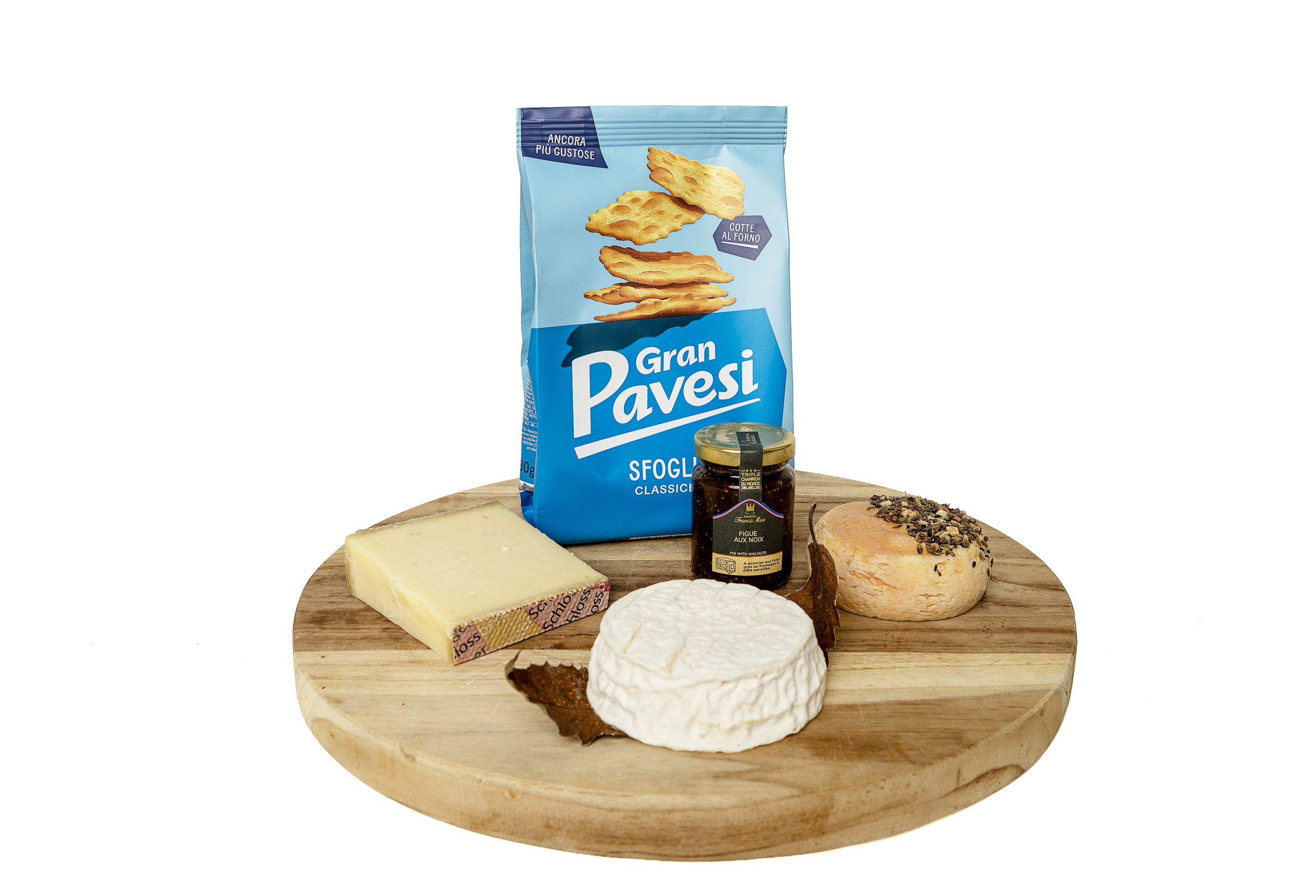 De combinatie van kaas, confiture en knapperige crackers maakt dit pakket geschikt voor een borrel of als afsluiting van een diner.